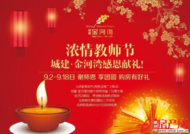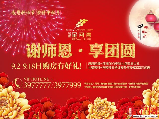 滕州房產(chǎn)網(wǎng) 2016-09-14為慶祝教師節(jié),感恩回饋廣大教師,城建·金河灣在教師節(jié)期間特意為教師準(zhǔn)備了專屬優(yōu)惠,在活動(dòng)期間,憑借教師資格證購房,在原有優(yōu)惠的基礎(chǔ)上可享受總房款直減8000元的購房鉅惠。值中秋佳節(jié)之際,城建·金河灣借中秋團(tuán)圓之意,9月9日-15日特在售樓處...