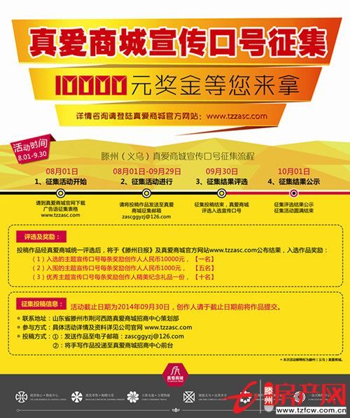 滕州房產(chǎn)網(wǎng) 2014-10-20一、活動(dòng)主題滕州真愛商城廣告語征集二、活動(dòng)時(shí)間和地點(diǎn)2014年08月01日——9月30日三、活動(dòng)背景為進(jìn)一步擴(kuò)大滕州真愛商城的對(duì)外知名度和影響力,同時(shí)助力真愛商城一期的盛大開業(yè),面向全國(guó)公開征集滕州真愛商城宣傳口號(hào)。四、活動(dòng)形式1、征集原則...