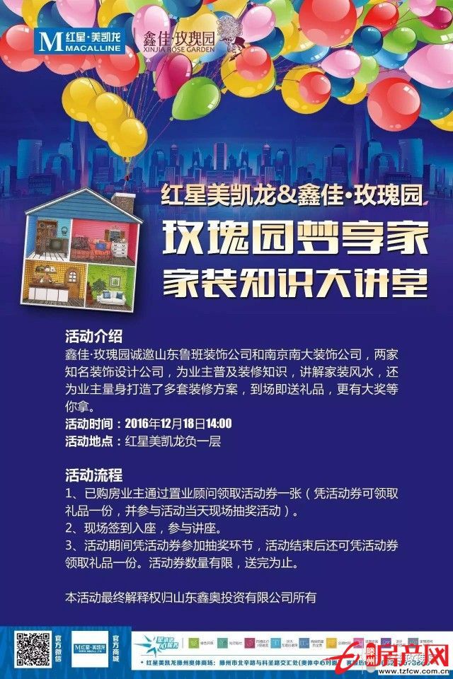 滕州房產(chǎn)網(wǎng) 2016-12-19鑫佳·玫瑰園誠(chéng)邀山東魯班裝飾有限公司和南京南大裝飾公司,兩家知名裝飾公司,為業(yè)主普及裝修知識(shí),講解家裝風(fēng)水,還未業(yè)主量身大招了多套裝修方案,到場(chǎng)即送禮品,更有大獎(jiǎng)等你拿?;顒?dòng)時(shí)間:2016年12月18日14:00活動(dòng)地點(diǎn):紅星美凱龍負(fù)一層活...