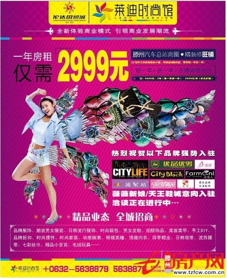 2012-09-17精品業(yè)態(tài)全城招商一年房租僅需2999元租一年+送一年+店鋪裝修設(shè)計薇薇新娘/天王鞋城意向入駐洽談?wù)谶M行中……銷售熱線:0632-5638879/5638876地址:倫達國貿(mào)城商管中心(北辛路汽車總站西側(cè))...