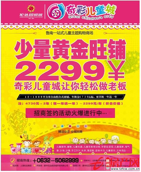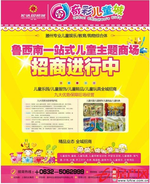 2013-01-11魯南一站式兒童主題購物商場少量黃金旺鋪讓你輕松做老板招商簽約活動火爆進行中···招商熱線:0632-5062999招商中心:山東省滕州市倫達國貿(mào)城商管中心一樓(汽車總站西鄰)...