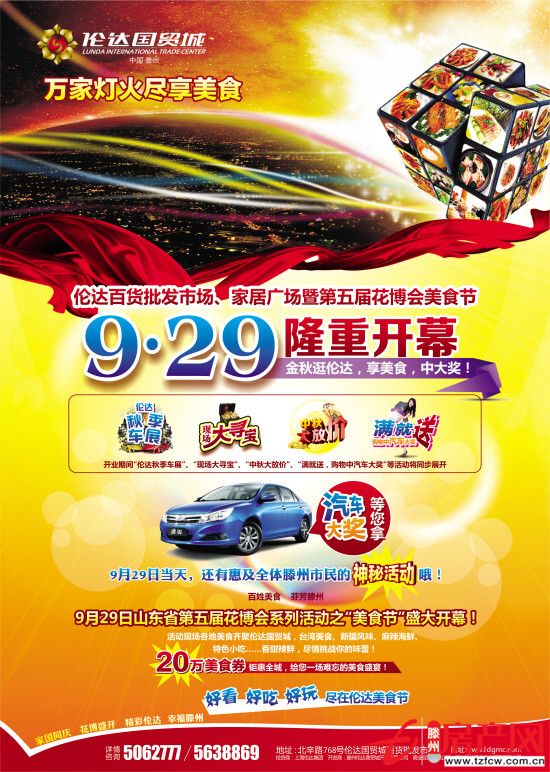 2012-09-24百姓美食芬芳滕州9·29倫達百貨批發(fā)市場、家居廣場盛裝開業(yè)暨第五屆花博會系列活動之“倫達美食城”隆重開幕!2012秋季“安馳·比亞迪”杯倫達大型汽車展銷會將同步舉行詳情咨詢:0632-5062777/5638869地址:滕州市北辛路768號...