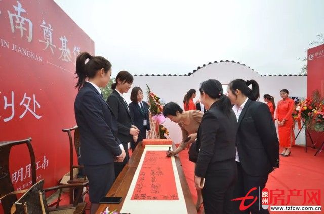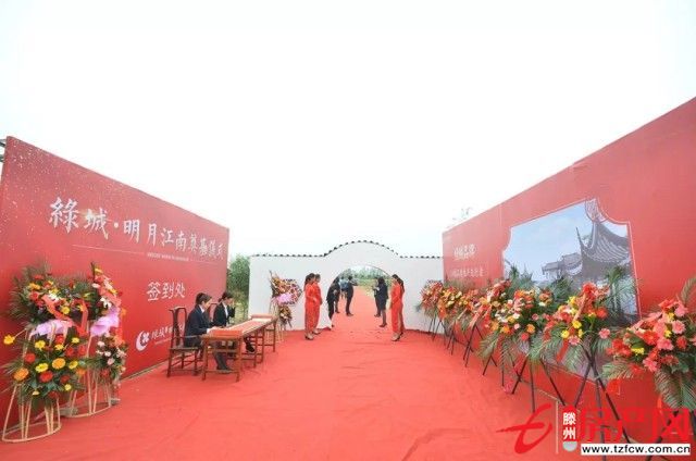 眾目以待中,項目工地現(xiàn)場彩旗飄揚、中國龍鼓喧天,來自中鐵置業(yè)、綠城、綠城·明月江南項目的200余位賓客,走過嶄新的紅地毯,走過標志著江南意趣的綠城圓拱門,在簽到處鄭重寫下名字,參與到這一滕州人居的標志性盛會中。