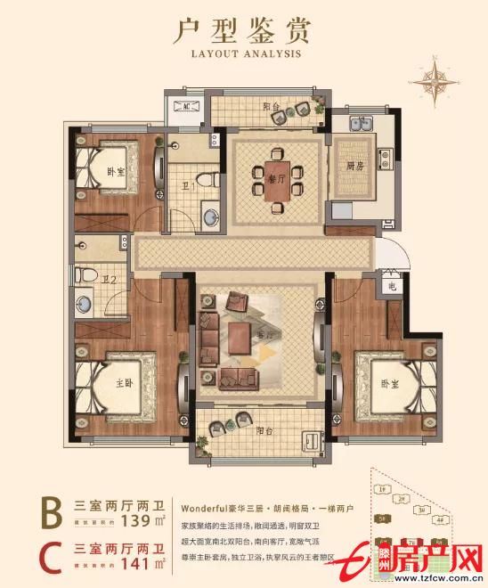 住宅采用人性化設(shè)計,有90㎡、124㎡、139㎡等戶型,做到面積適中,全透全明,南北通透,動靜分區(qū),景觀雙陽臺,落地大窗,讓住戶充分享受田園風光。