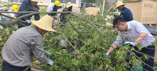 工作人員正在修樹葉
