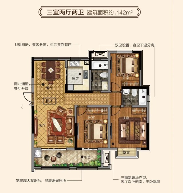 建面約113-142㎡三面寬戶型,南北通透,戶戶雙陽臺,采光極佳,視野開闊。