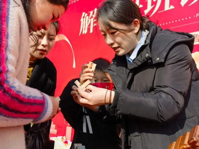 在自己動手拼魯班鎖的環(huán)節(jié)中,家人們遇到了難題,數(shù)個不同形狀的長條榫卯相接的結(jié)構(gòu),有許多不同的可能。在手工老師的教學(xué)下似乎能夠拼湊完成,但是只要一拆散,似乎又無法復(fù)原,這也許就是榫卯結(jié)構(gòu)的魅力所在。雖然榫卯皆可相接,但只有正確的拼接順序才能將它結(jié)合成一個完整的魯班鎖。