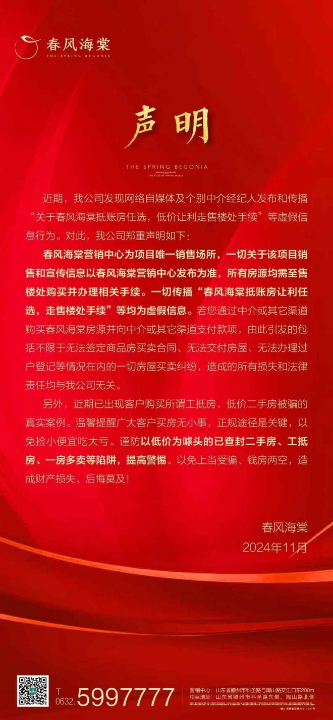 關(guān)于春風(fēng)海棠抵賬房任選,低價(jià)讓利走售樓處手續(xù)的聲明