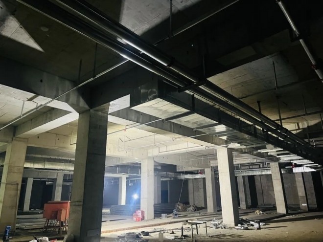 地下車庫施工現(xiàn)場,運(yùn)送材料、組裝通風(fēng)管。