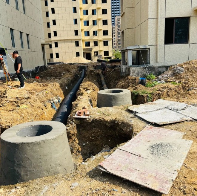 室外雨污管網(wǎng)鋪設(shè):管網(wǎng)工程正在緊鑼密鼓施工,工人們?nèi)缤叵隆翱椌W(wǎng)師”,精心鋪設(shè)每一段管道。從坡度校準(zhǔn)到接口密封,每一處細(xì)節(jié)都經(jīng)過嚴(yán)格檢測,確保排水系統(tǒng)高效運(yùn)行,為未來的舒適生活保駕護(hù)航。