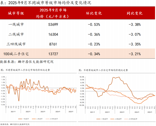 報告顯示,9月一線城市市場均價為53699元/平方米,環(huán)比下跌0.53%,同比下跌3.38%。二線城市市場均價為16304元/平方米,環(huán)比下跌0.36%,同比下跌3.07%。三四線城市市場均價為8761元/平方米,環(huán)同比分別下跌0.23%、3.35%。
