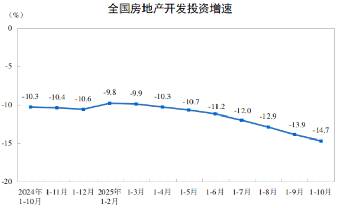 具體來看,房地產(chǎn)開發(fā)投資增速方面,1-10月份,全國房地產(chǎn)開發(fā)投資73563億元,同比下降14.7%;其中,住宅投資56595億元,下降13.8%。