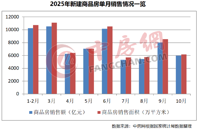 從商品房單月銷售情況來看,今年“銀十”旺季不旺,銷售指標(biāo)同環(huán)比均出現(xiàn)下滑態(tài)勢(shì)。根據(jù)國家統(tǒng)計(jì)局?jǐn)?shù)據(jù)測(cè)算,10月新建商品房銷售面積為6147萬平方米,環(huán)比下降27.95%,同比下降19.61%;新建商品房銷售額5977億元,環(huán)比下降25.52%,同比下降25.05%。