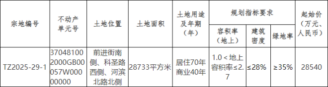 規(guī)劃指標(biāo)要求:容積率:1.0<地上容積率≤2.7;建筑密度≤28%;綠地率≥35%。起始價28540萬元,按照最高容積率2.7計算,折合樓面價約3678.83元/㎡。