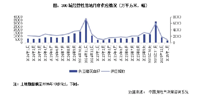 根據(jù)克而瑞研究中心發(fā)布的報告,截至2026年1月25日,土地供應建筑面積為3360萬平方米,環(huán)比下降50%,同比下降8%。本月監(jiān)測城市平均供地容積率為1.96,優(yōu)質(zhì)低密宅地成為供應主力。