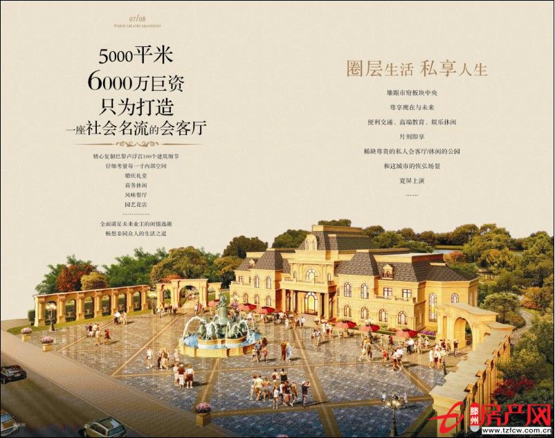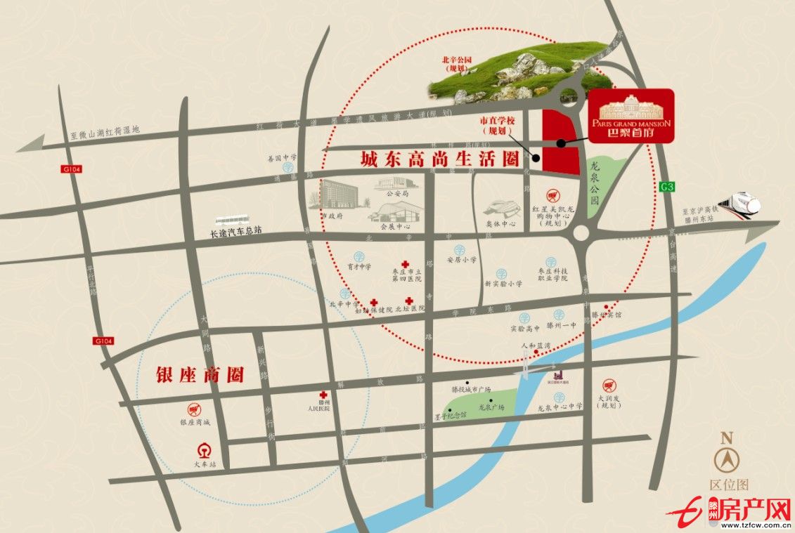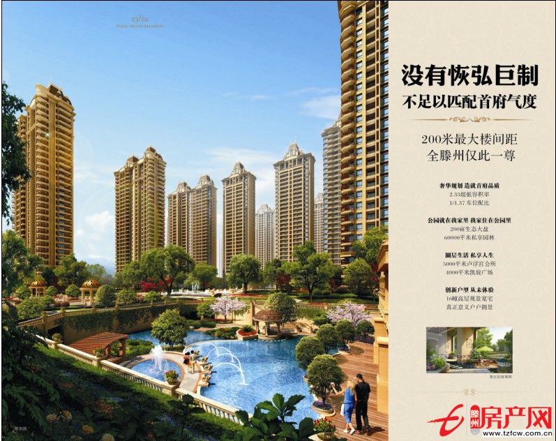 項(xiàng)目位于紅荷大道與龍泉北路交叉口,東靠龍泉北路,南臨通盛路,項(xiàng)目總占地200畝,總建筑面積40萬方,分為南北區(qū)塊,包括有16棟高層景觀建筑,五星級酒店,甲級寫字樓,奢華會所,情景式商業(yè)街.項(xiàng)目開發(fā)遵循90%造景,10%造房的理念,在200畝的土地上僅規(guī)劃了16棟景觀住宅,平均樓間距都在100米以上,位于景觀中軸兩端的樓間距達(dá)到200米.容積率僅為2.33,層高3.1米,這在滕州是史無前例的.